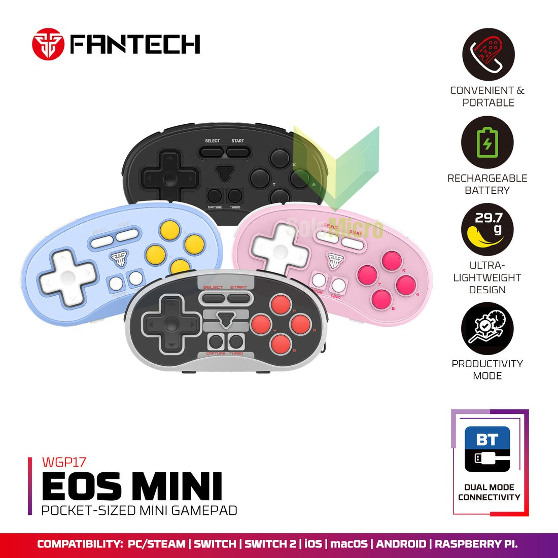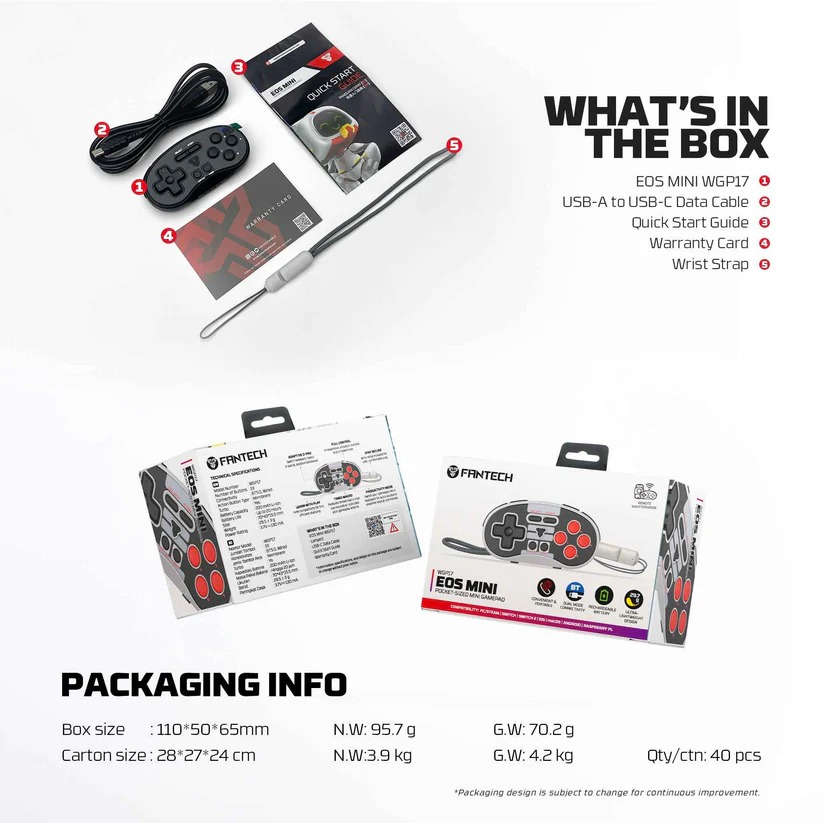Fantech EOS Mini WGP17 adalah gamepad nirkabel berukuran saku yang dirancang untuk portabilitas maksimal dan kompatibilitas multi-platform, ideal untuk bermain game di mana saja.