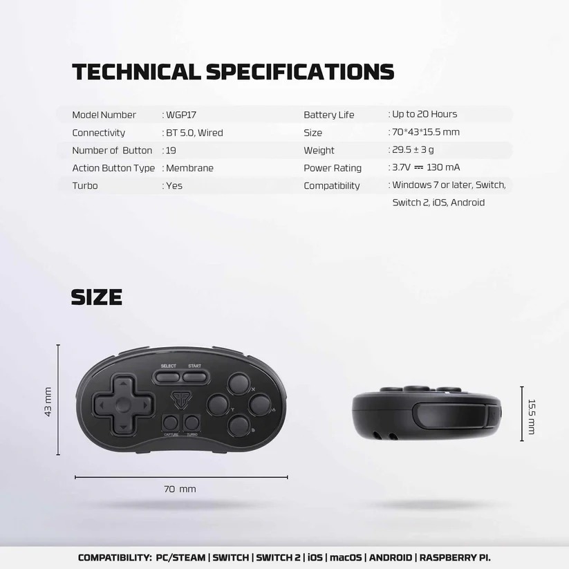- Kompatibilitas Luas: Gamepad ini dirancang untuk berfungsi di berbagai platform, termasuk Android, iOS, Windows, Nintendo Switch & Switch 2, hingga Raspberry Pi.