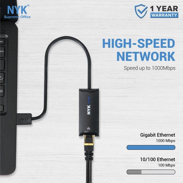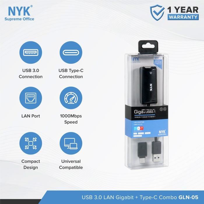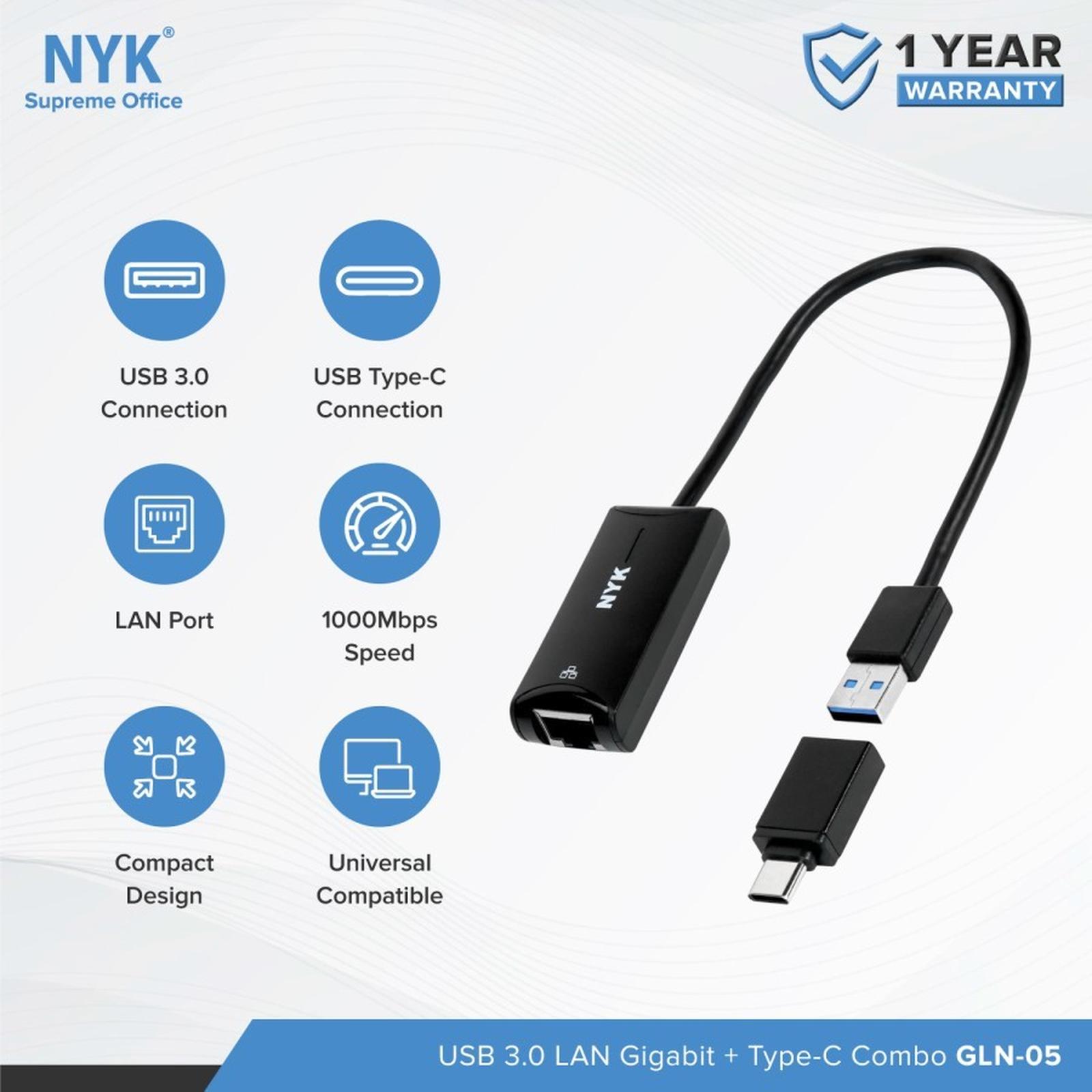 NYK LAN Adapter GLN 05 USB 3.0 To Lan Gigabit + Type C Combo Koneksi Cepat 1000Mbps Chip USB 3.1 Kompatibel dengan Laptop PC Network Printer