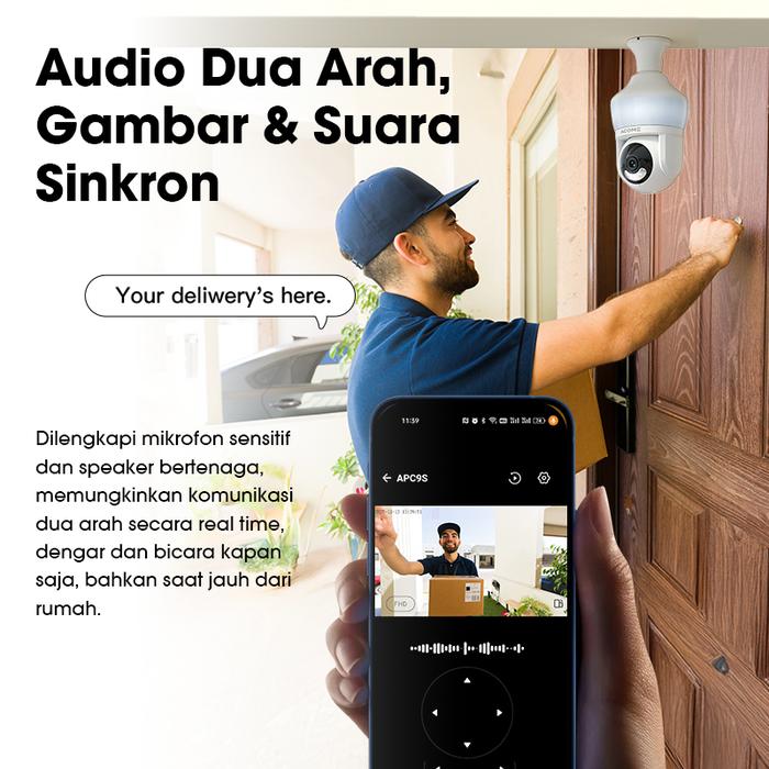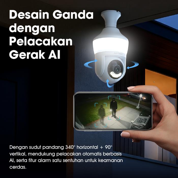 Acome CCTV Bohlam APC9S hadir dengan Kamera ultra-kernih 2K 3MP (1296P), desain E27 tanpa kabel yang praktis, Dilengkapi Lingkaran lampu 24 LED terang, pengawasan full-color siang malam. Tahan cuaca IP6, komunikasi dua arah, deteksi & pelacakan gerak.