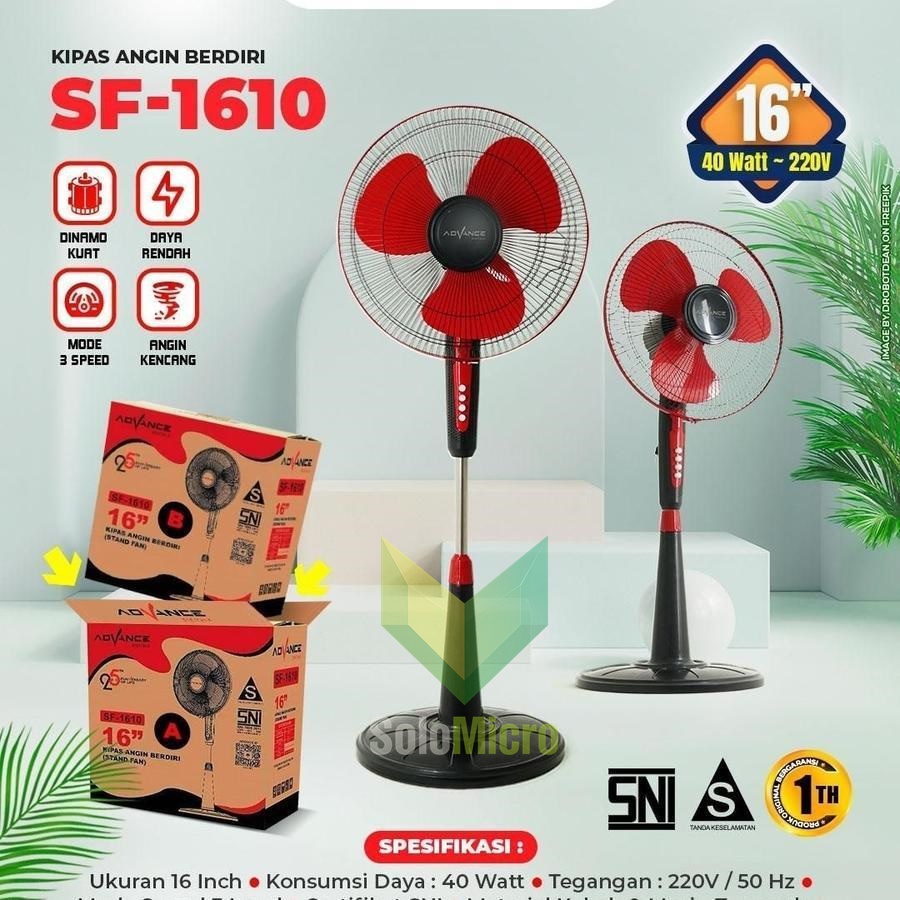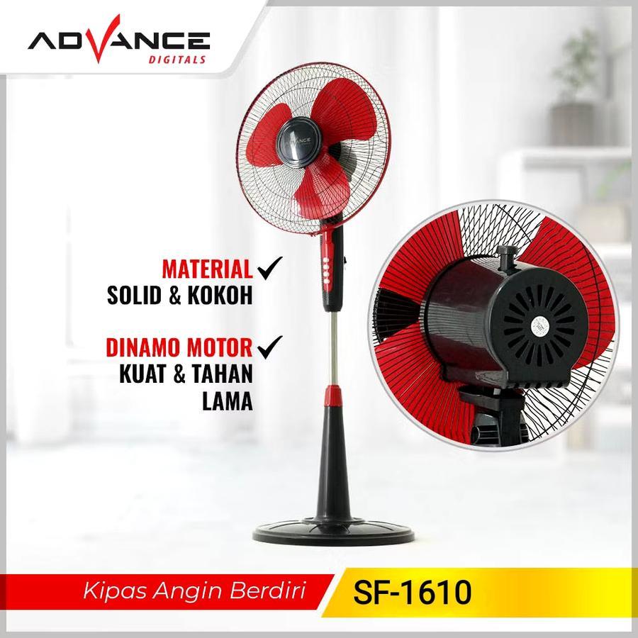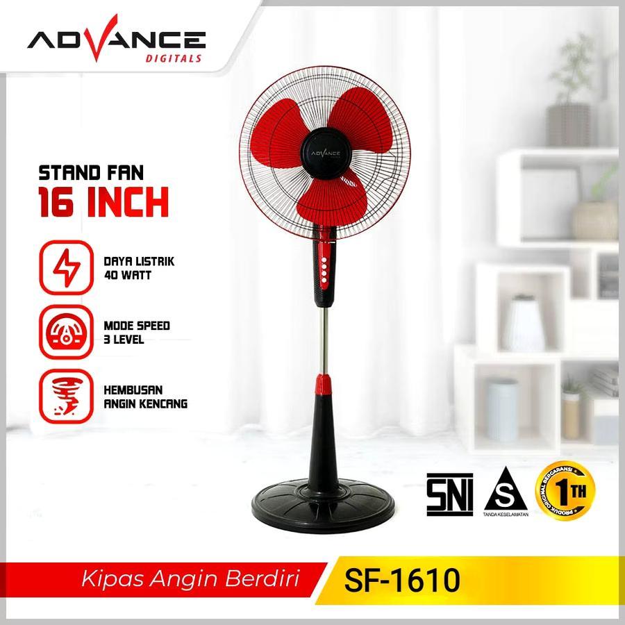 Advance Kipas Berdiri Stand Fan 16inch SF 1610 Nikmati kenyamanan maksimal dengan kipas angin 16 inci yang dirancang untuk memberikan aliran udara yang segar dan sejuk. Dilengkapi dengan tiga bilah kipas yang memastikan distribusi udara merata dan efektif. Tersedia dalam tiga pilihan kecepatan angin, Anda dapat memilih intensitas yang paling sesuai dengan kebutuhan, apakah itu angin lembut untuk tidur nyenyak atau angin kuat untuk mendinginkan ruangan dengan cepat. Kipas ini cocok digunakan di rumah, kantor, atau ruang kerja, memberikan kesejukan yang tahan lama [ Spesifikasi Teknis ] - Ukuran Kipas: 16 inci - Bilah Kipas: 3 bilah - Pengaturan Kecepatan: 3 tingkat kecepatan - Tegangan: 220V - Frekuensi: 50-60Hz - Daya: 40 Watt - Bahan: ABS Glossy (untuk landasan kipas), Besi anti karat (untuk net cover), Pipa Stainless Steel (untuk stand adjustable) 3d