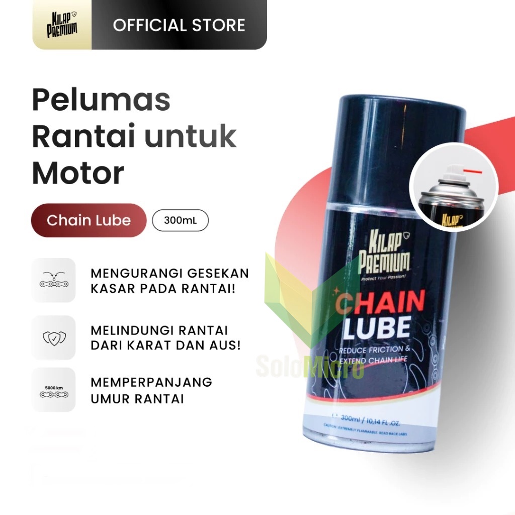 Chain Lube by Kilap Premium dapat melubrikasi rantai sehingga umur pakai semakin panjang serta terlindungi dari potensi karat dan aus. Chain Lube dapat mengurangi suara berisik yang disebabkan oleh kurang baiknya lubrikasi pada rantai. Chain Lube cocok untuk rantai jenis X-Ring, O-Ring, maupun Z-Ring!