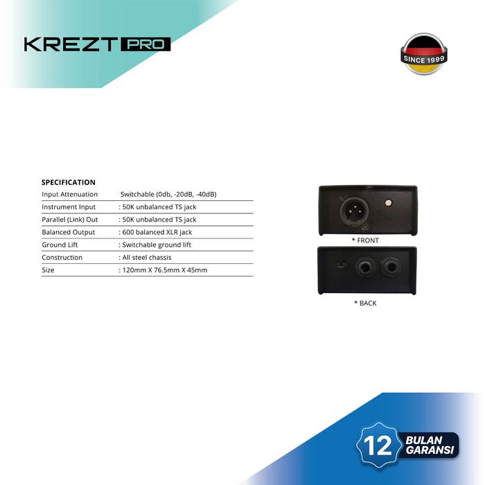 KREZT PRO DB-01 adalah Direct Box pasif mono DI BOX. Dirancang untuk sinyal instrumen yang unbalanced dan high impedance. Cocok untuk perangkat audio profesional. 🎵