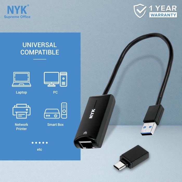 NYK LAN Adapter GLN 05 USB 3.0 To Lan Gigabit + Type C Combo Koneksi Cepat 1000Mbps Chip USB 3.1 Kompatibel dengan Laptop PC Network Printer