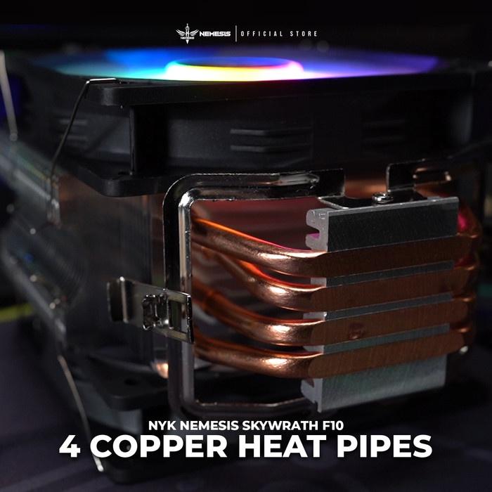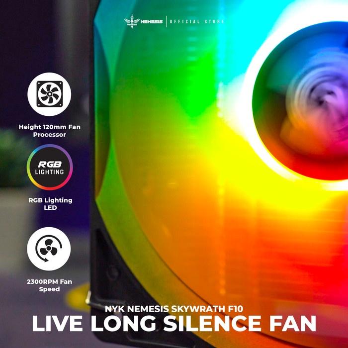 NYK NEMESIS Skywrath F10 is a RGB fan processor that have high performance dual fan, long live , silence sound and beautiful RGB LED lighting that makes your case more cool and beautiful at the same time. This fan support 4 Heat Pipes and have height 120mm