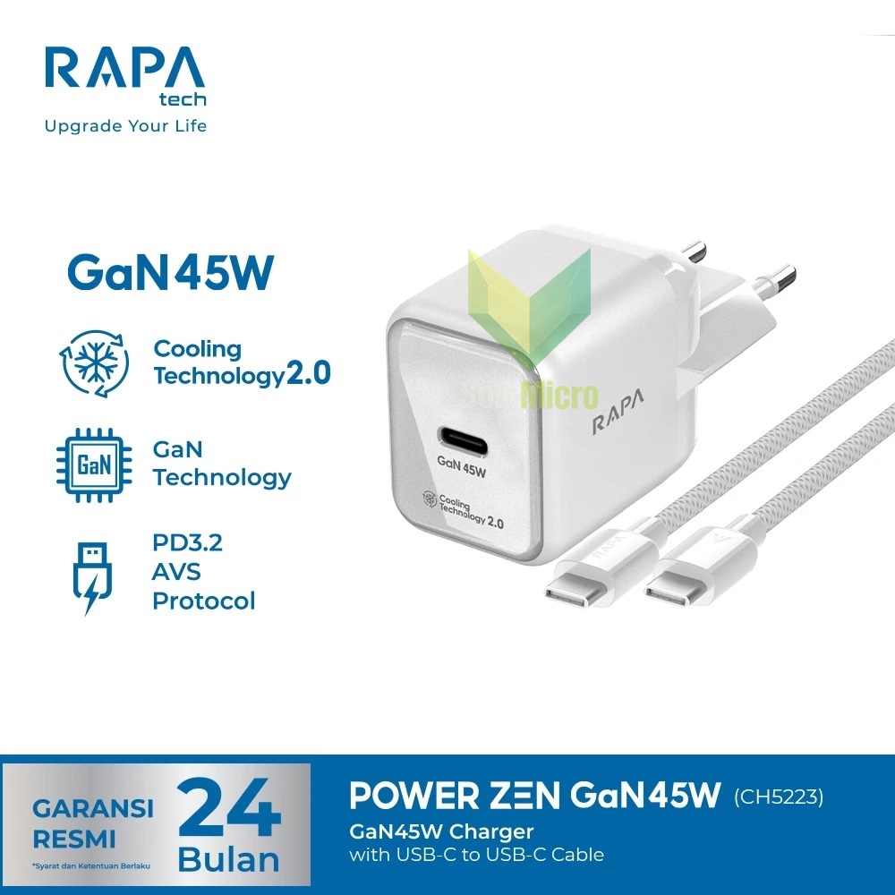 Charger RAPA CH5223 (atau RAPA POWER ZEN GaN 45W) adalah adaptor daya generasi terbaru yang dirancang untuk pengisian daya yang efisien dan cepat untuk berbagai perangkat, termasuk iPhone dan Android.