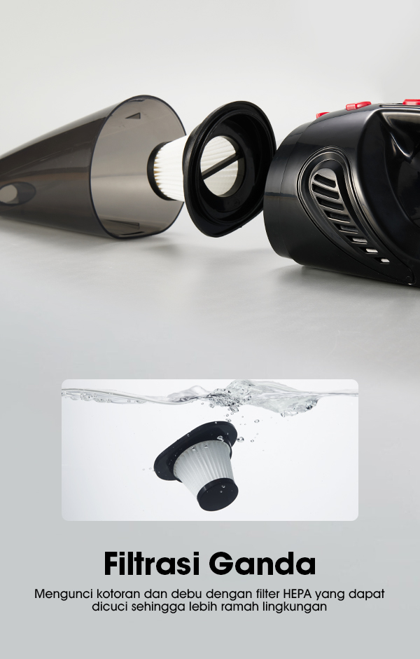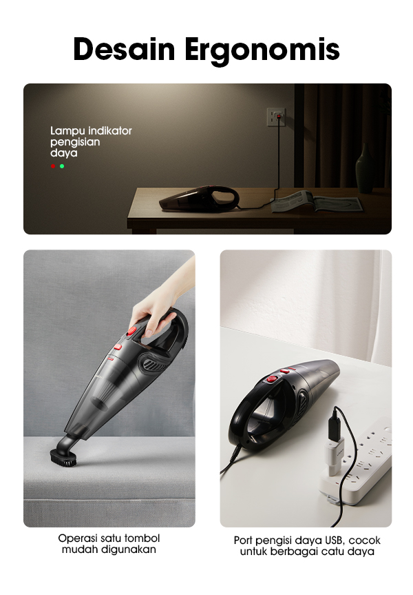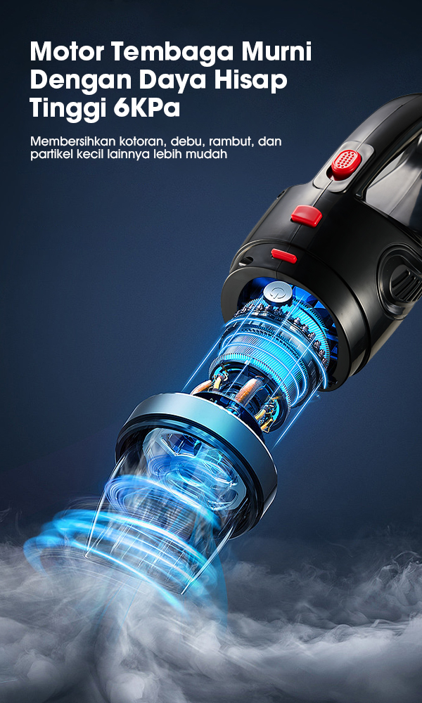 Penggunaan Mudah Dengan Wireless Portable Tanpa Kabel Untuk Menyedot Dan membersihkan Debu,Bisa digunakan untuk membersihkan sudut2 - Rumah,Meja,Perabot,interior Mobil,Karpet,Tempat Tidur,Dsb Baterai Daya 2000mAh yg dapat digunakan utk daya Sedot 6000Pa daya Hisap sampai 25 Menit Filter Ganda Dengan Lapisan HEPA Filter Yang mengunci Kotoran dan HEPA yang dapat di cuci Ulang Model : SW-VC06 Type : Wet and dry use Voltage : DC 5V Rated Power: 120W Battery: 2 lithium batteries, 2000mAh Suction Power : 6kPa / 6000Pa Dust cup capacity : 500ml Size : 349*99*134mm Kelebihan : - Tanpa Kabel - Pemakaian hingga 25 menit - Daya hisap tinggi - Port pengisian daya USB - Mudah digunakan - Design ergonomis Pack Accessories 2*Connection head, 1*Flat Suction 1*Brush, 1*Hose