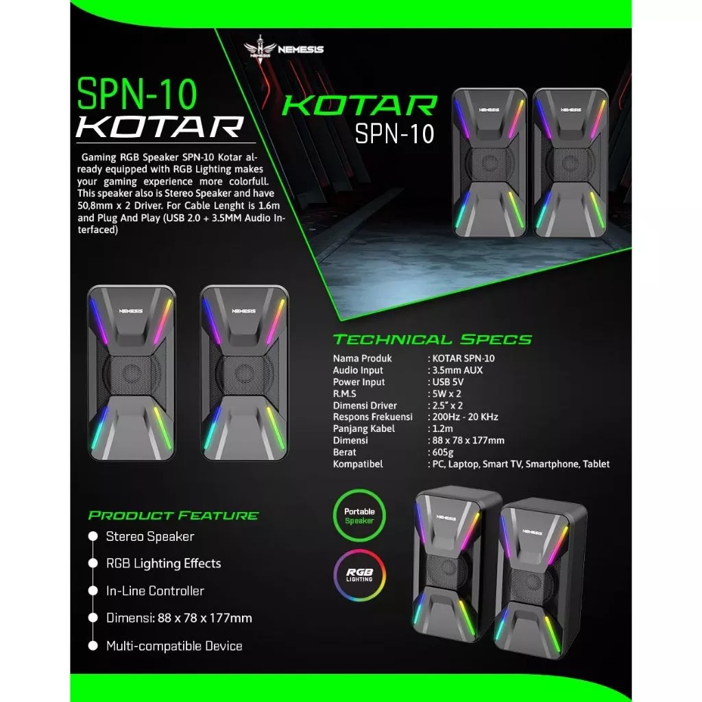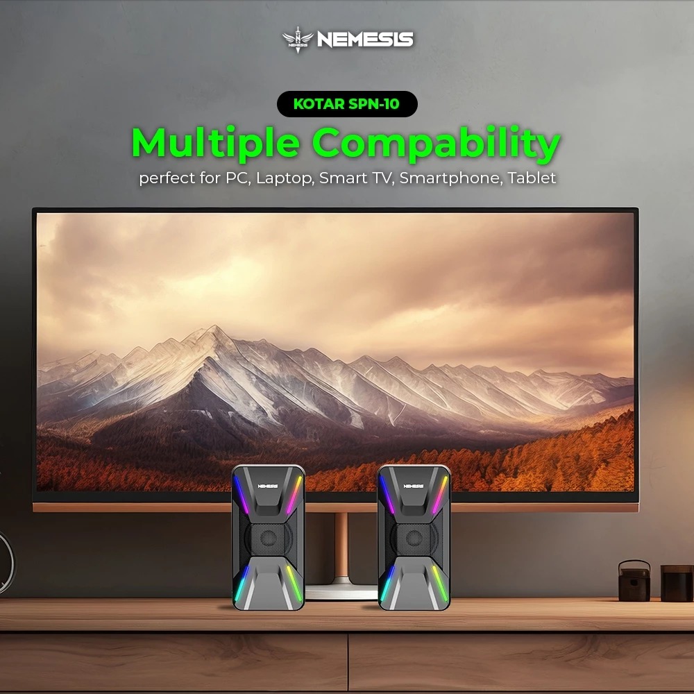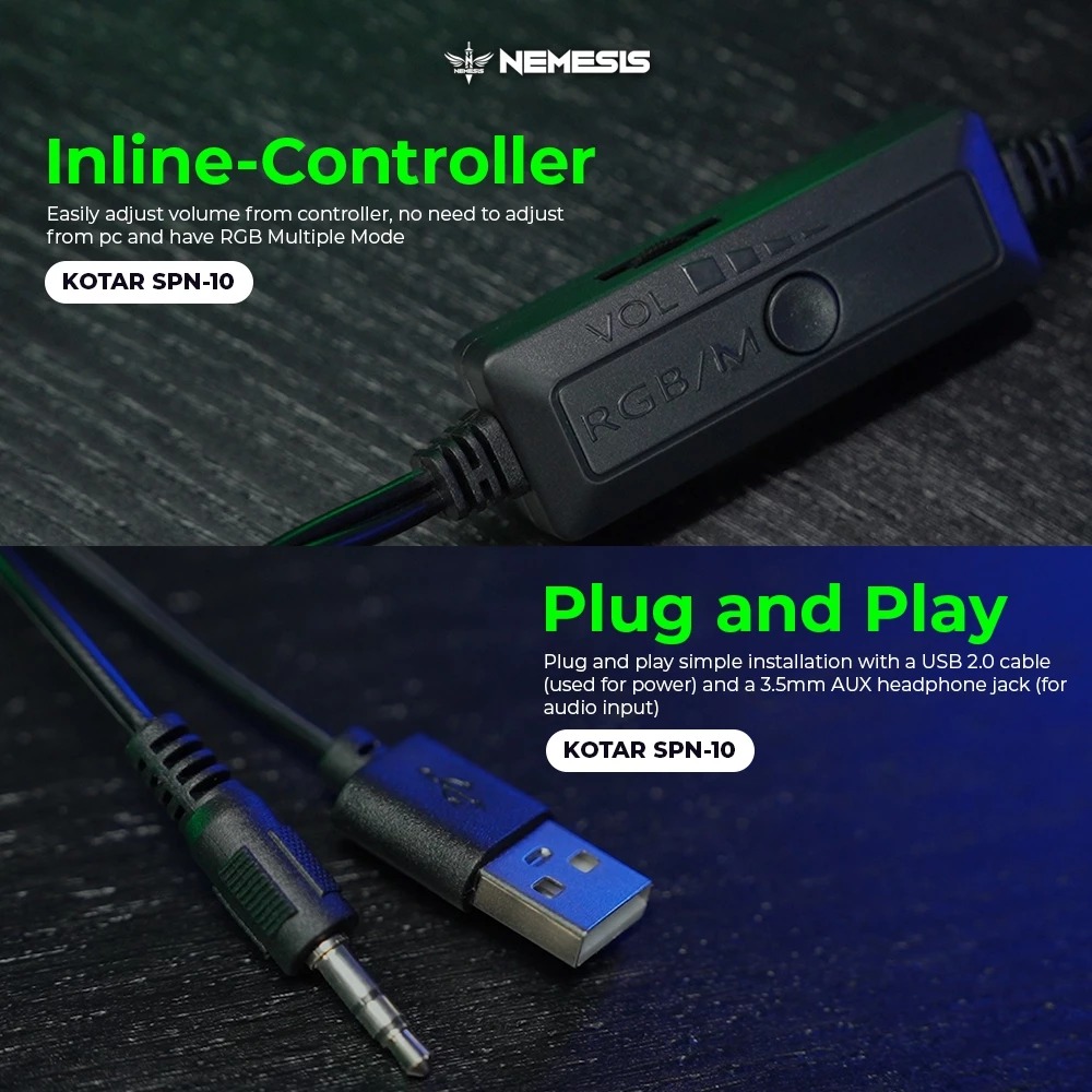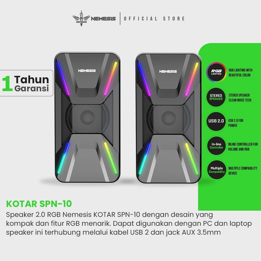 Speaker 2.0 RGB Nemesis KOTAR SPN-10 dengan desain yang kompak dan fitur RGB menarik. Dapat digunakan dengan PC dan laptop, speaker ini terhubung melalui kabel USB 2 dan jack AUX 3.5mm, tanpa memerlukan baterai tambahan. Produk ini baru dan dilengkapi garansi produsen untuk memberikan kepercayaan lebih dalam pembelian Anda.
