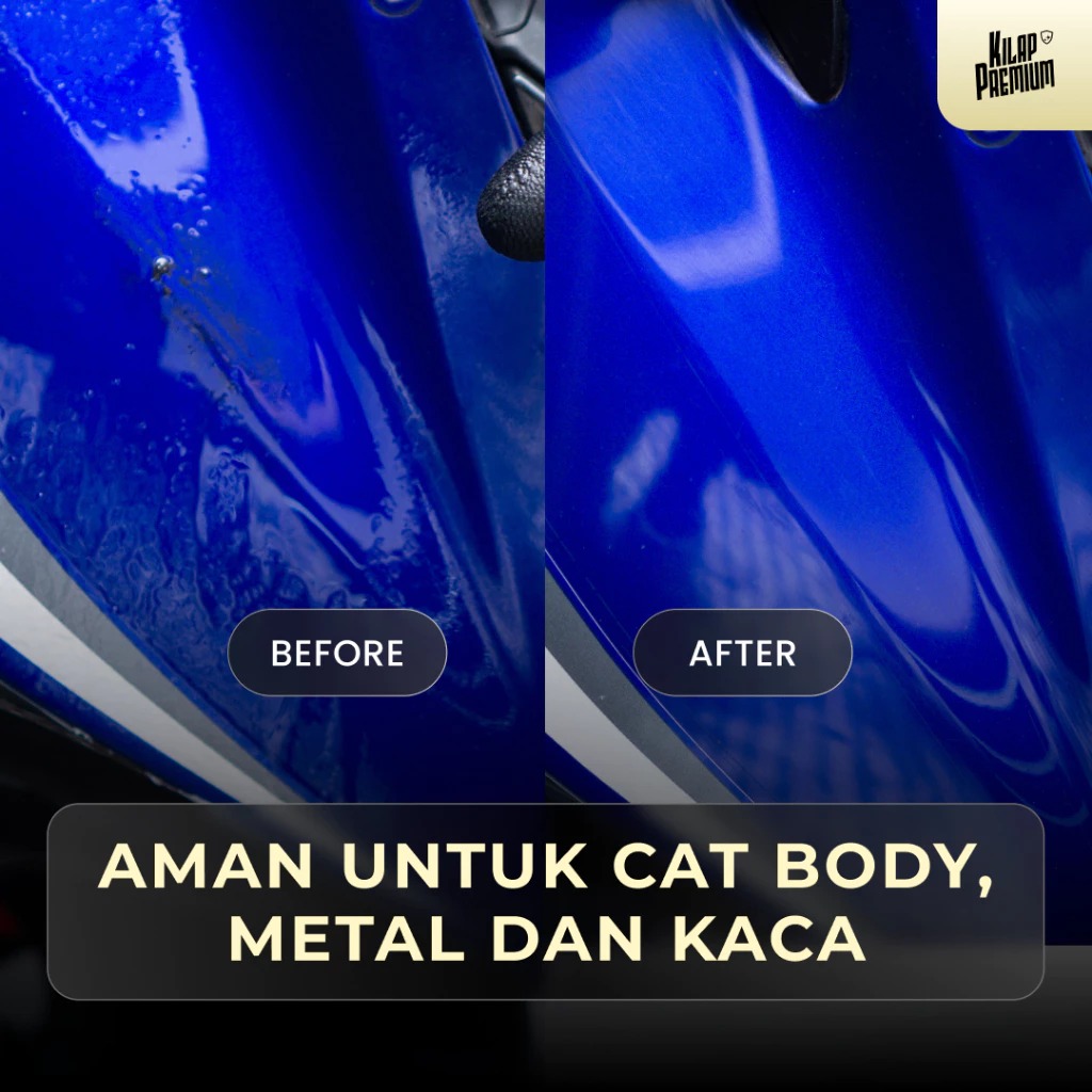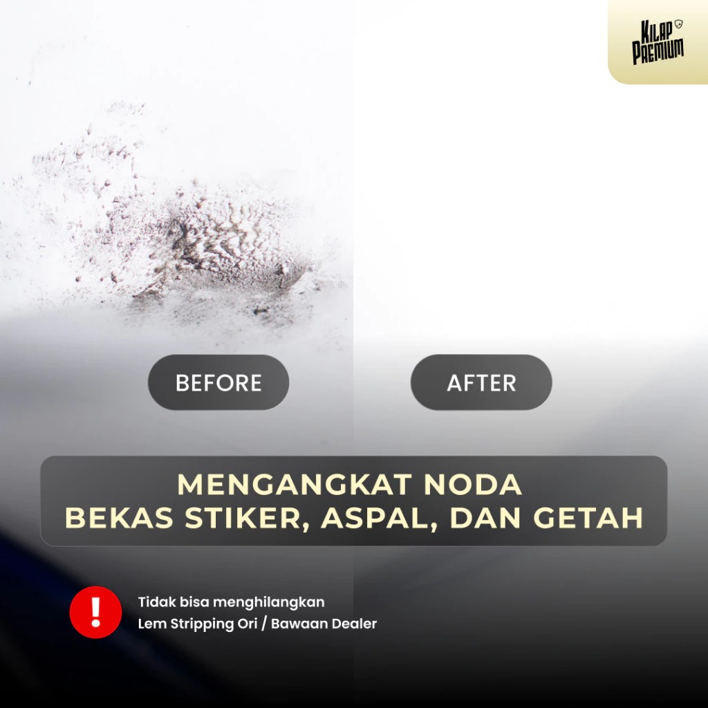 STR by Kilap Premium akan mengangkat bekas stiker, noda aspal, dan kontaminan organik lainnya seperti noda serangga maupun getah pohon dengan cepat. STR aman digunakan pada cat, metal, dan kaca pada mobil dan motor.
