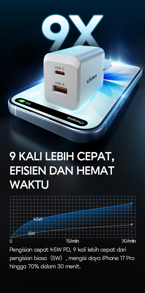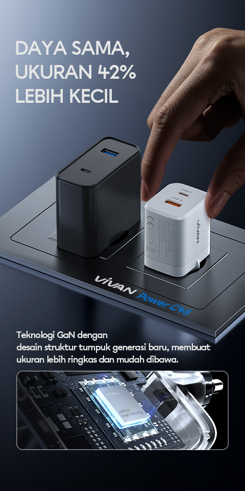 Didukung USB-C Power Delivery (PD), Vivan C45 mampu mengisi daya smartphone, tablet, hingga laptop ringan secara cepat dan aman. Sistem smart protection memberikan perlindungan menyeluruh dari arus berlebih, tegangan berlebih, dan panas berlebih.