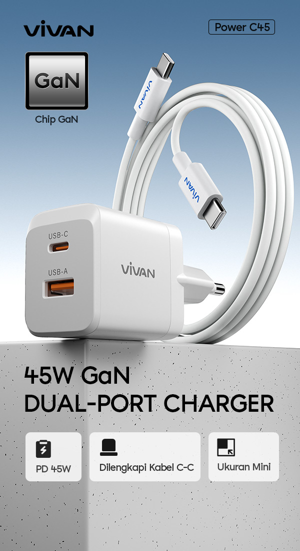 Vivan GAN Charger C45 adalah charger cepat berdaya 45W yang dilengkapi kabel Type-C to Type-C, siap digunakan tanpa perlu membeli aksesori tambahan. Menggunakan teknologi GAN (Gallium Nitride), charger ini hadir dengan ukuran lebih ringkas, efisiensi tinggi, dan suhu tetap stabil saat pengisian.