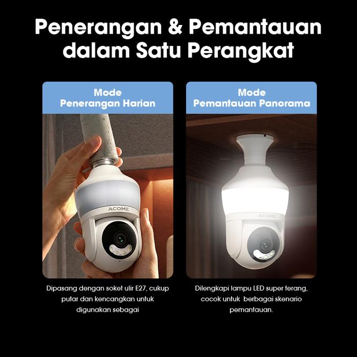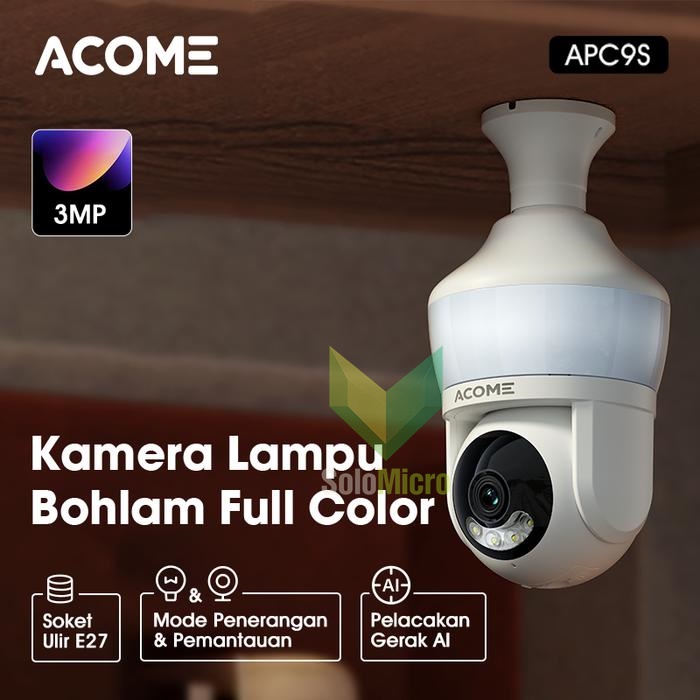 Acome CCTV Bohlam APC9S hadir dengan Kamera ultra-kernih 2K 3MP (1296P), desain E27 tanpa kabel yang praktis, Dilengkapi Lingkaran lampu 24 LED terang, pengawasan full-color siang malam. Tahan cuaca IP6, komunikasi dua arah, deteksi & pelacakan gerak.