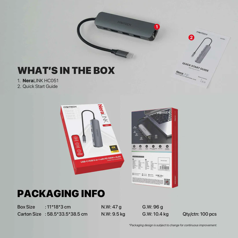 - FANTECH HC051 Converter USB Hub Type C 5in1 menawarkan LAN 100 Mbps dan PD100W untuk pengisian cepat.