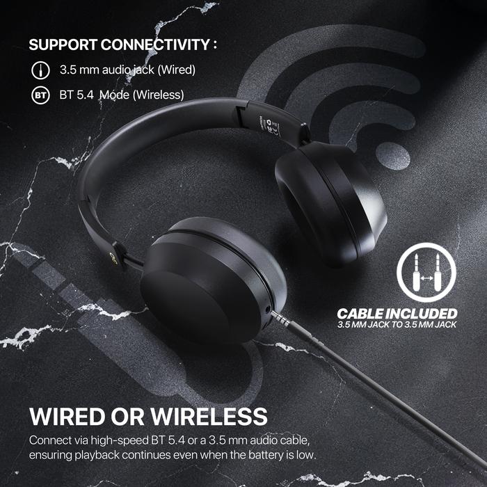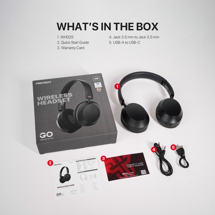 Headset GO Air WH02S telah dibekali dengan 2 mode konektivitas, yaitu mode wired menggunakan kabel audio 3.5 mm dan mode wireless menggunakan koneksi BT 5.4. Headset ini menawarkan jangkauan kompatibilitas yang luas sehingga bisa digunakan pada berbagai perangkat yang kamu punya.