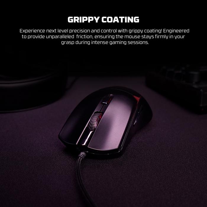 Mouse ini menggunakan Grippy Coating, membuat genggaman lebih baik sehingga mouse tetap stabil di tangan saat bermain. Lapisan ini memiliki tekstur khusus yang memberikan gesekan optimal, sehingga mengurangi selip bahkan dalam pergerakan cepat dan intens.