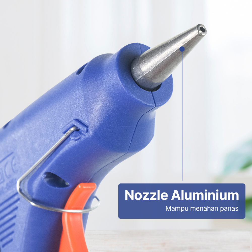 Material Berkualitas Pada bagian bodi pistol lem terbuat dari plastik berkualitas yang ringan namun kokoh sehingga awet untuk penggunaan jangka panjang. Pada ujung nozzle terbuat dari aluminium sehingga mampu menahan panas yang dihasilkan oleh alat ini. |