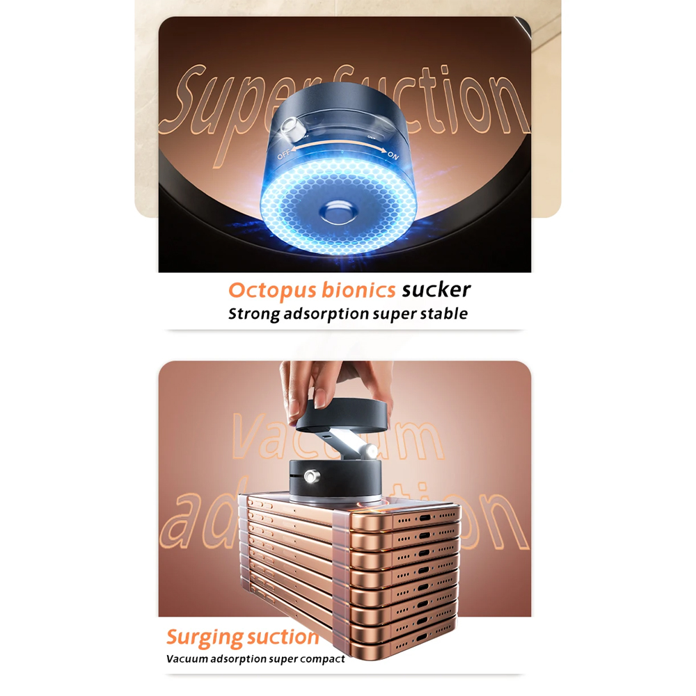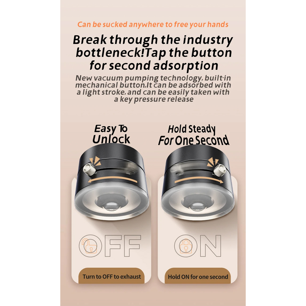 Hisapan Alas Kuat Dibekali dengan penghisap bionik gurita yang kompatibel untuk berbagai permukaan seperti plastik, kaca, metal, keramik, dan permukaan halus lainnya. Kekuatan hisapnya lebih besar daripada alas hisap biasanya. Anda bisa melepas dan memasang alas secara mudah dengan menggeser knob yang ada di alas. |