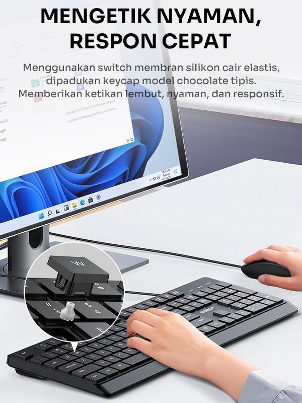 Keyboard hadir dengan 104 tombol full-size yang tahan hingga 10 juta klik, menggunakan switch membran silikon cair yang empuk, responsif, dan nyaman untuk mengetik dalam waktu lama. Tersedia juga 12 tombol multimedia untuk akses cepat ke musik, volume, dan fungsi PC lainnya.