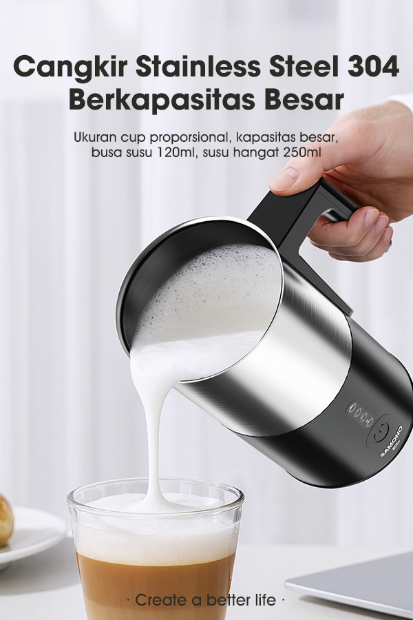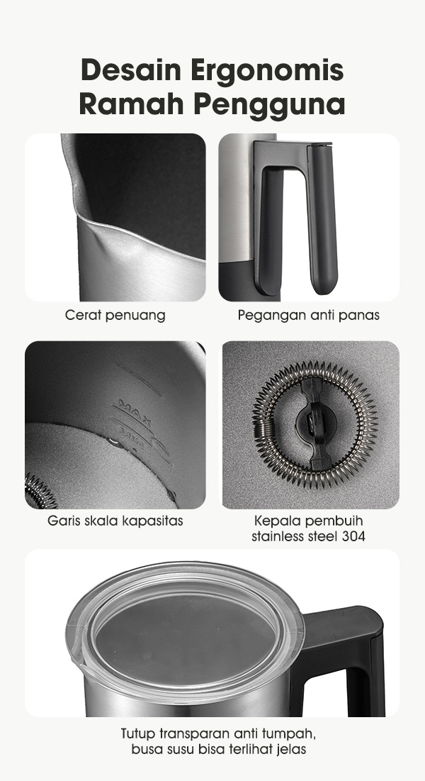 - 3 Pilihan Busa: Sesuaikan tekstur busa sesuai kebutuhan minuman seperti cappuccino, latte, atau macchiato.