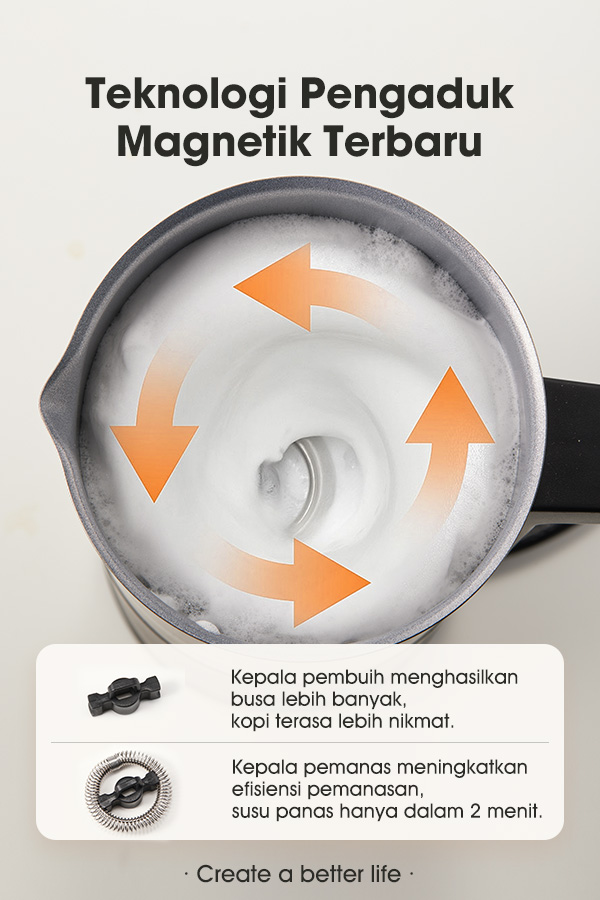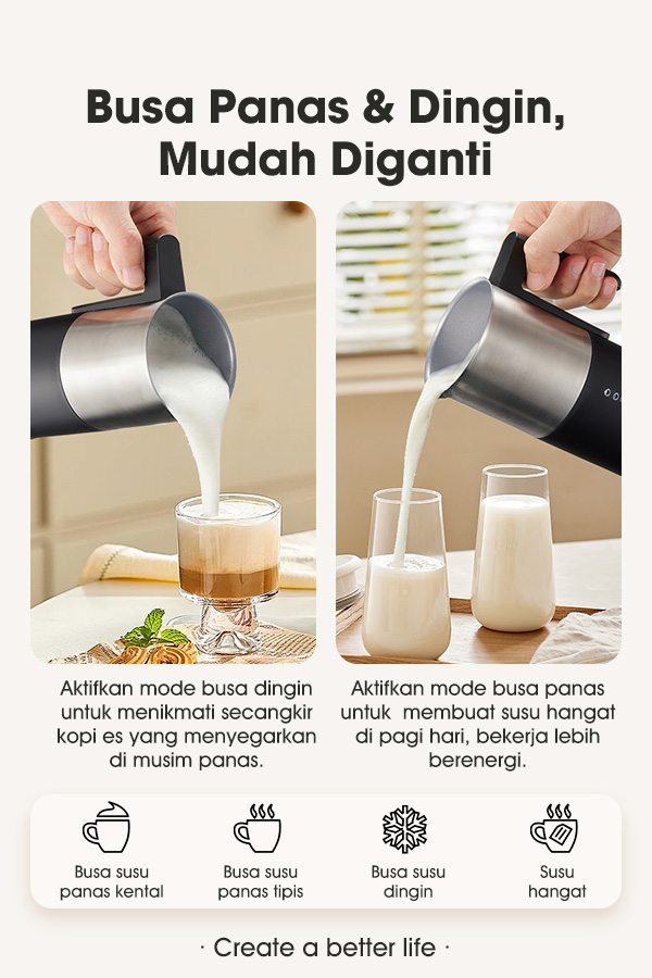 - 4-in-1 Multifungsi: Membuat 3 jenis busa susu (halus, tebal, dan dingin) serta fungsi pemanas susu.